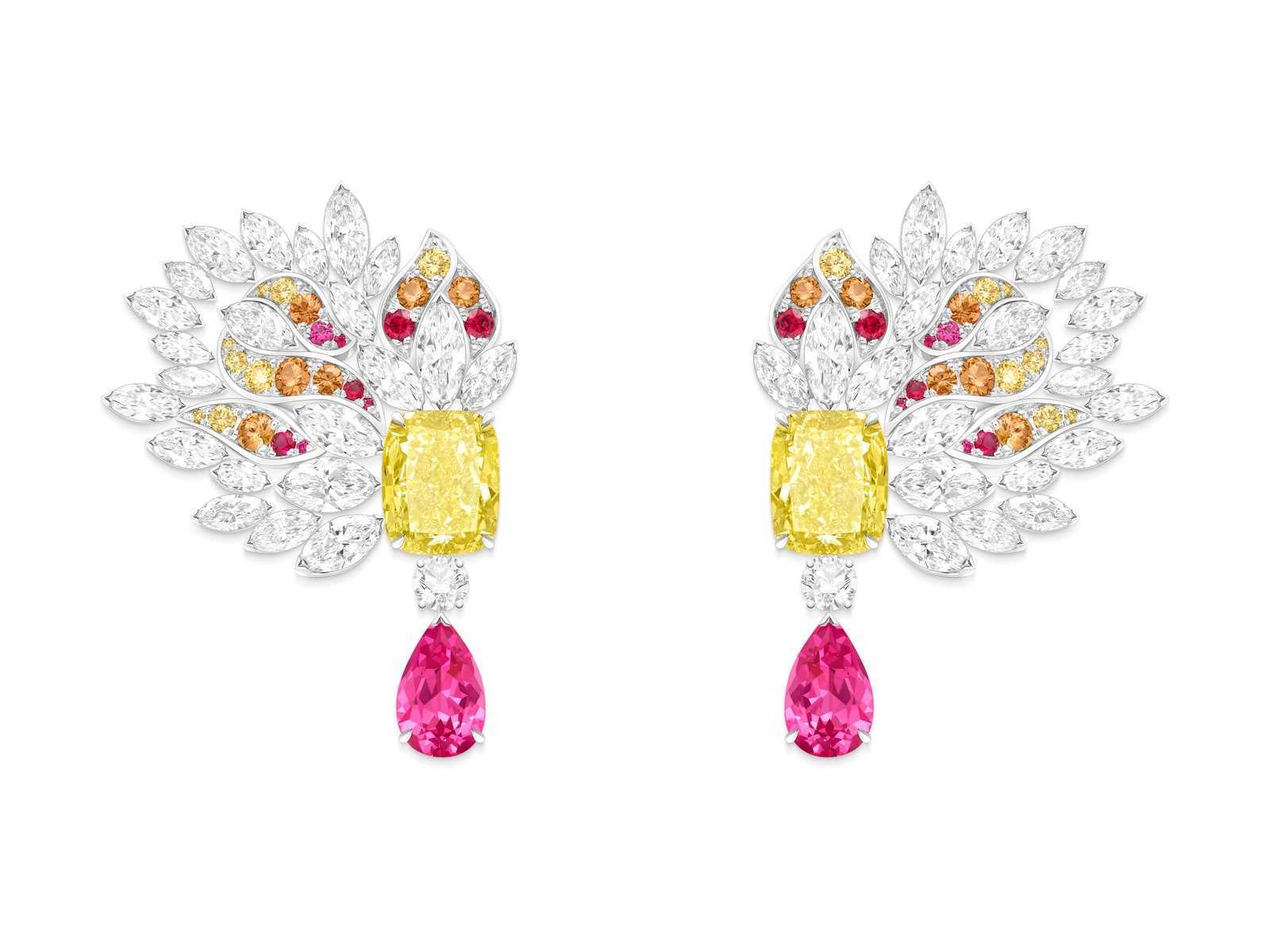 Серьги отличаются безупречным подбором центральных желтых и ярко-розовых сапфиров