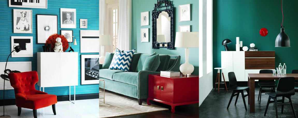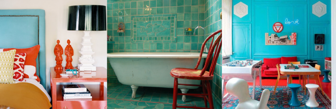 Электрическому аквамариновому можно предпочесть бирюзовый или цвет морской волны. Если сочные цветовые контрасты кажутся слишком резким решением, присмотритесь к приглушенным оттенкам этой цветовой пары или используйте красный в качестве точечных акцентов.