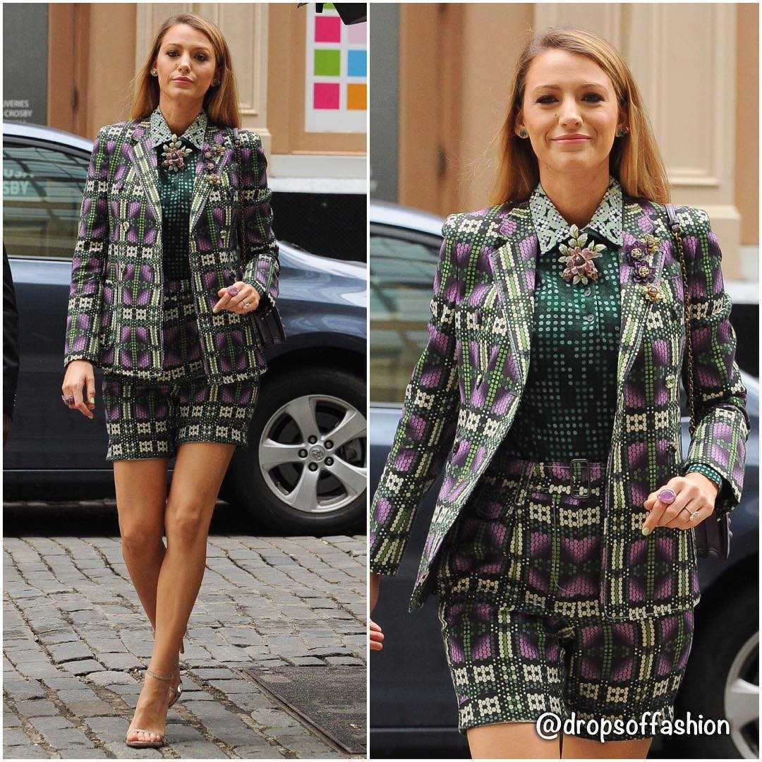 И снова Блейк не дала опомниться публике, в тот же день продемонстрировав еще один костюм в сиреневых и изумрудных оттенках, на этот раз в летнем варианте с шортами. Его она дополнила мини-сумочкой в тон орнаменту на жакете и шортах и открытыми босоножками на шпильке.