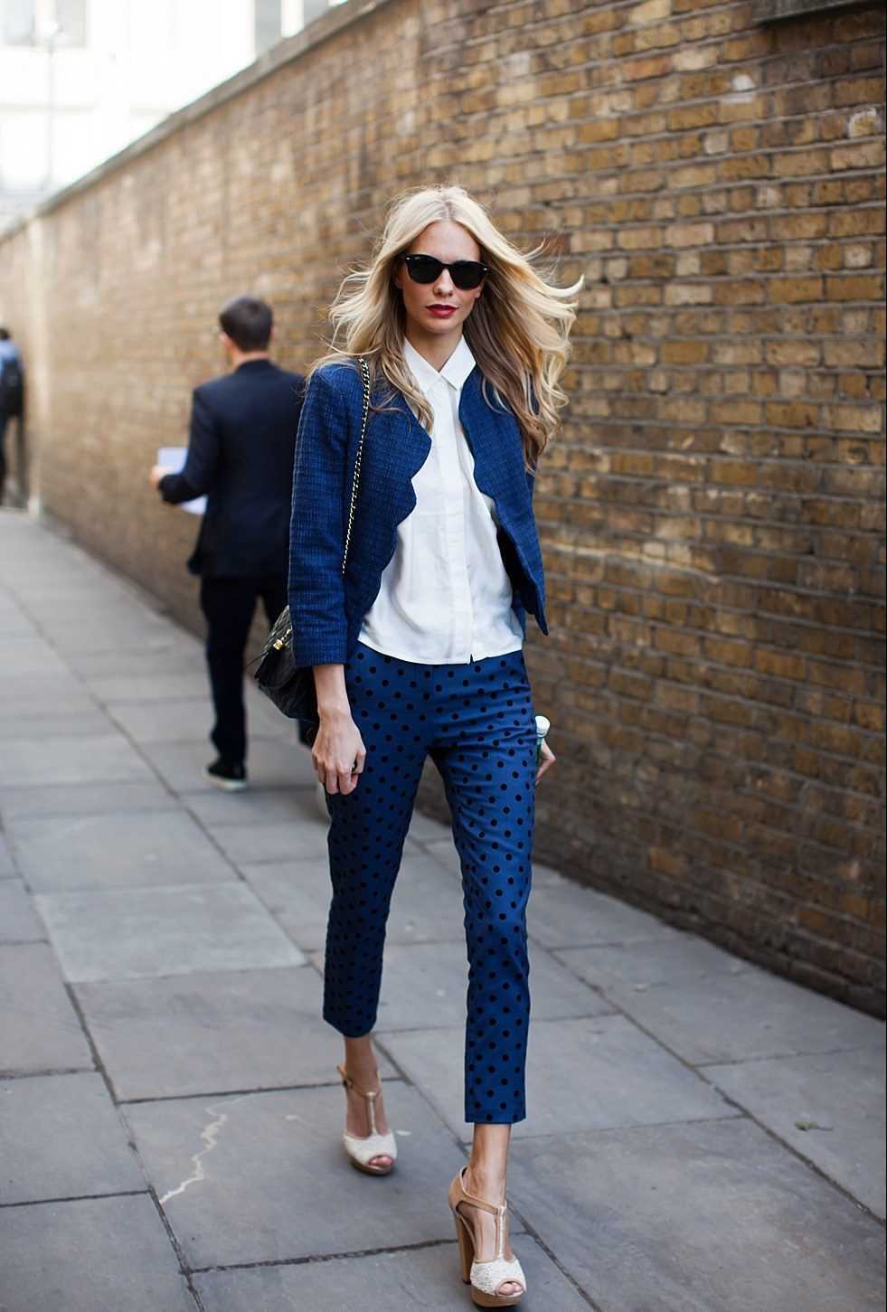 Под пиджак отлично подходят темно-синие брюки данного типа, синий цвет отлично сочетается как с нейтральной одеждой, так и с цветным дополнением.