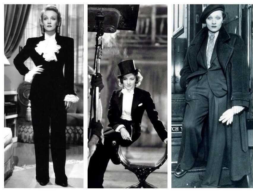 Вплоть до начала XX века брючный костюм (в том виде, в котором мы привыкли его видеть) был исключительно прерогативой мужчин. Конечно, женщины пытались примерить мужской костюм, но это был либо вызов, либо карнавальный наряд. И вот в 30-х годах Марлен Дитрих создала культовый узнаваемый образ, прибегнув к брючному костюму. А в дальнейшем и сами брюки получили её имя — «брюки в стиле Марлен Дитрих».