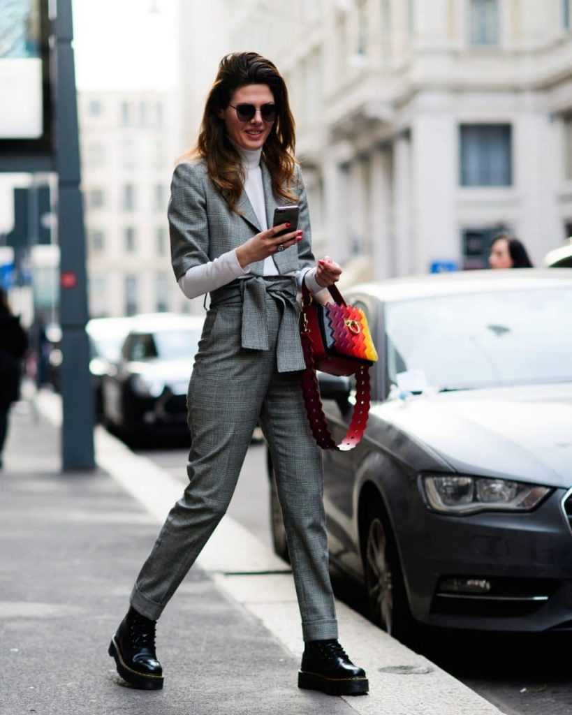 - аналогично можно подбирать и обувь, она может быть классического черного цвета, хорошо смотрятся и пастельные варианты или яркие насыщенные тона. Единственно, чего следует избегать, это серые угги, сапоги или ботинки такого же оттенка, поскольку они будут сливаться с вещью в одно целое;