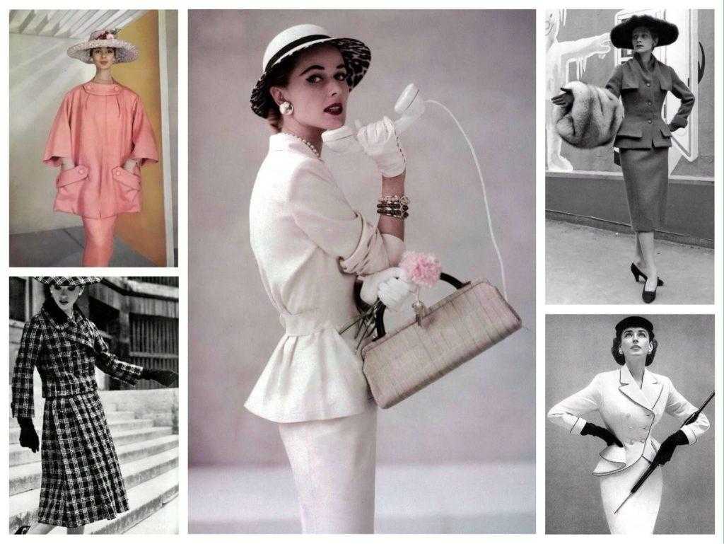 Основным атрибутом каждой девушки стал широкий пояс, подчеркивающий талию. Он может быть контрастного цвета или в тон к одежде. Сделать образ изящным помогали шляпки и перчатки. Особым спросом пользовались шляпки-таблетки и широкополые модели.