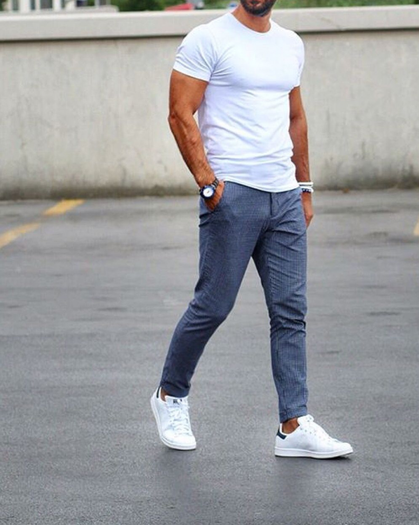 Парни также комбинируют спортивную обувь с разной одеждой. Это могут быть джинсы, свитшоты, деловые костюмы, рубашки, пальто и кожаные куртки. С белыми кроссовками любой образ сразу же становится модным и необычным.