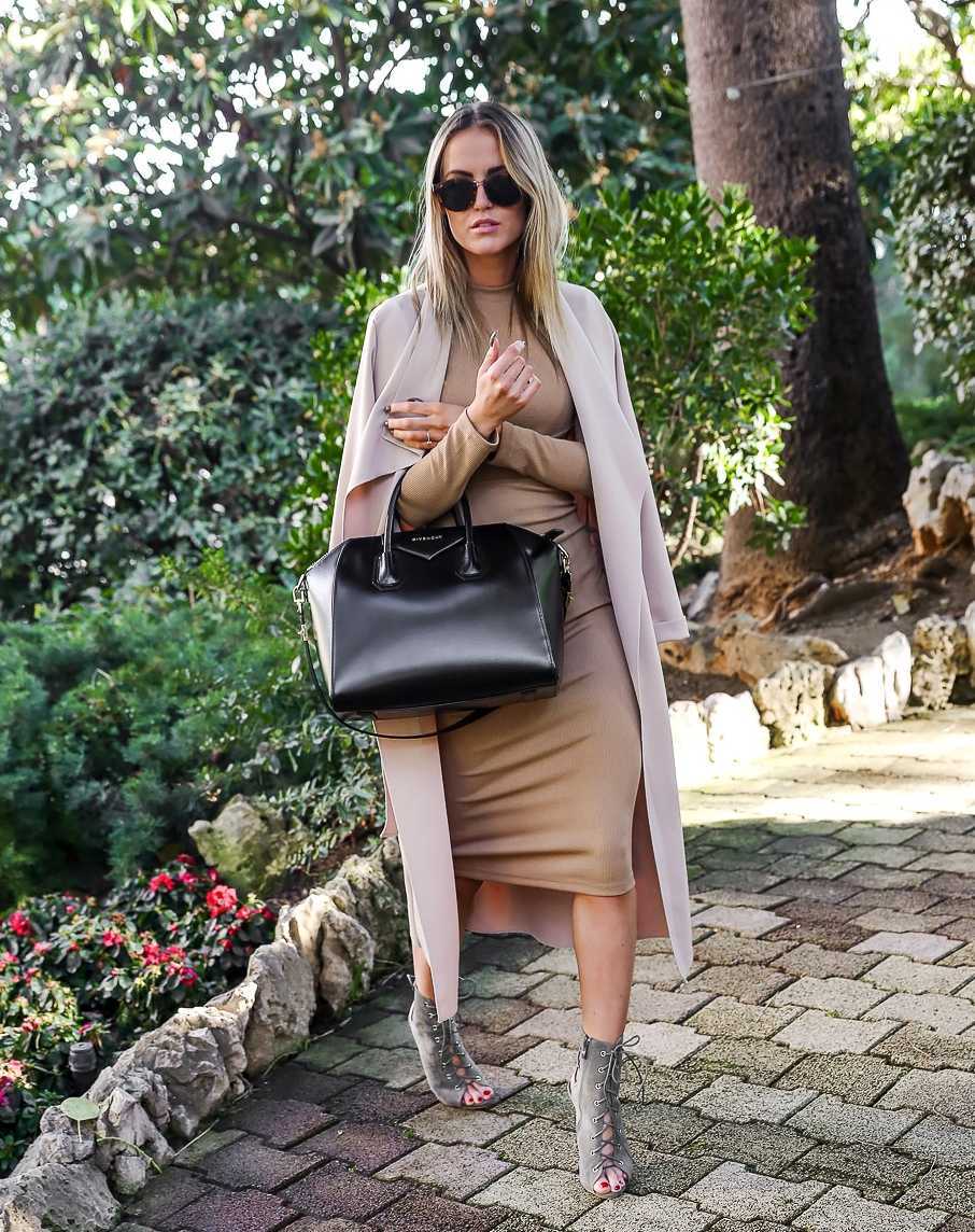 Пальто или кардиган в комплект к бежевым сапожкам можно подобрать, как в бежево-коричневой гамме, так и нейтрального цвета, например, серого или темно-синего.