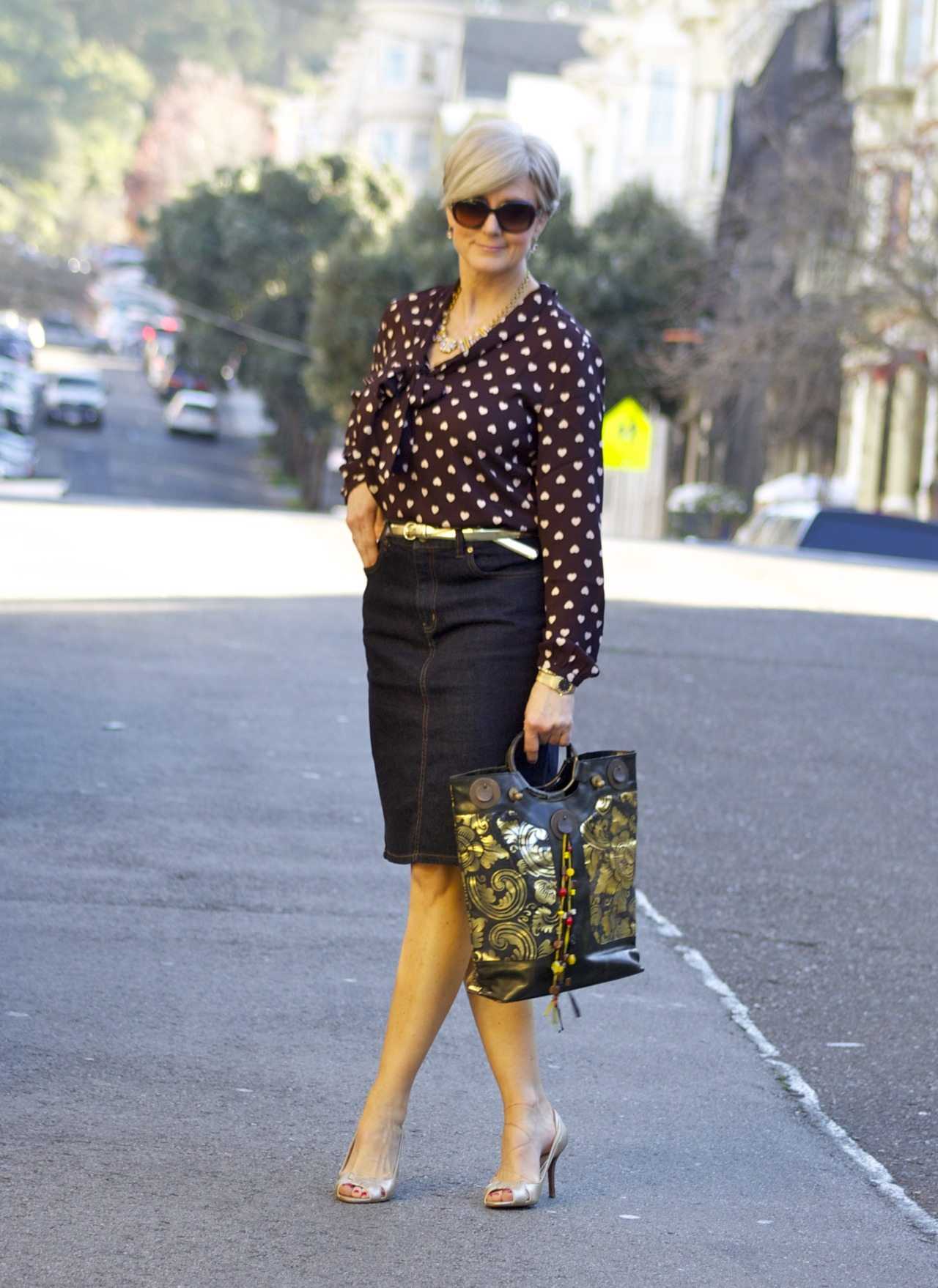 Женщинам за 50 лучше не надевать платья и юбки длиной выше колена. Оптимальной высотой юбки станет «по колено» и ниже. Короткие юбки в таком возрасте — дурной вкус, который неправильно будет расценен окружающим.