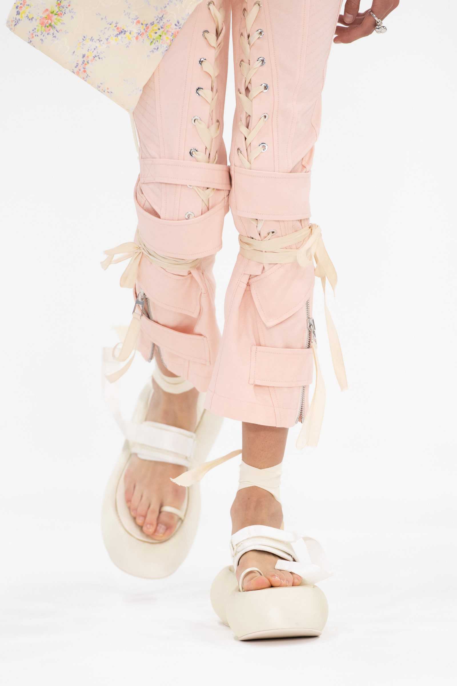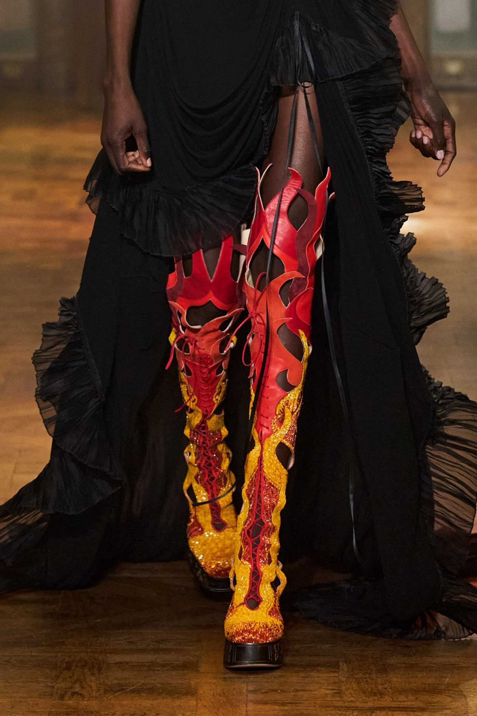 Продемонстрировали много обуви с мерцающими брошками и блестящими петлями, дополненные различным декором, броскими принтами и неоновыми оттенками.