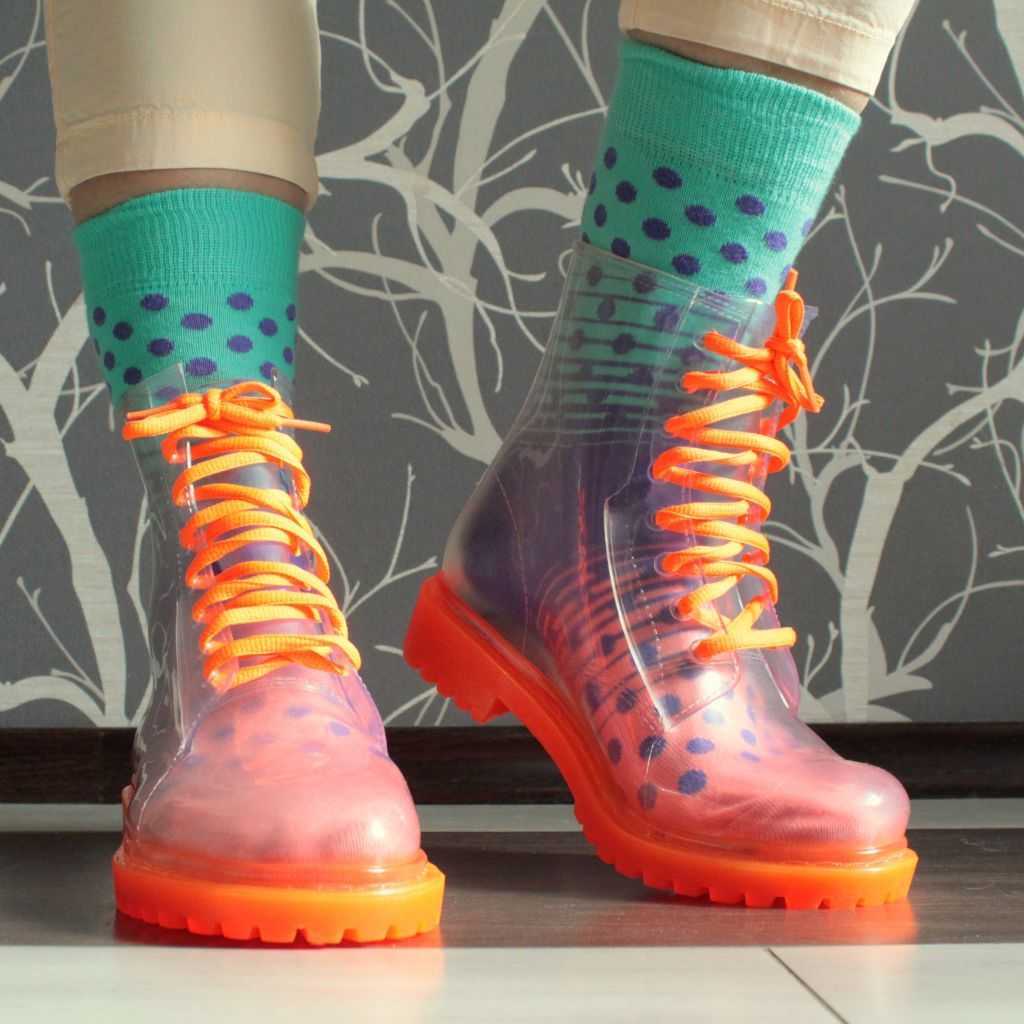 Имейте в виду, что под прозрачные ботинки стоит надевать только чистые и яркие носочки или гольфы. В такой обуви ваши ноги всегда будут на виду, поэтому стоит заранее позаботиться о паре стильных носков без катышек, а тем более без дыр. Дизайнеры рекомендуют выбирать яркие модели не только ботинок, но и носков, используя контраст между этим стильным сочетанием.