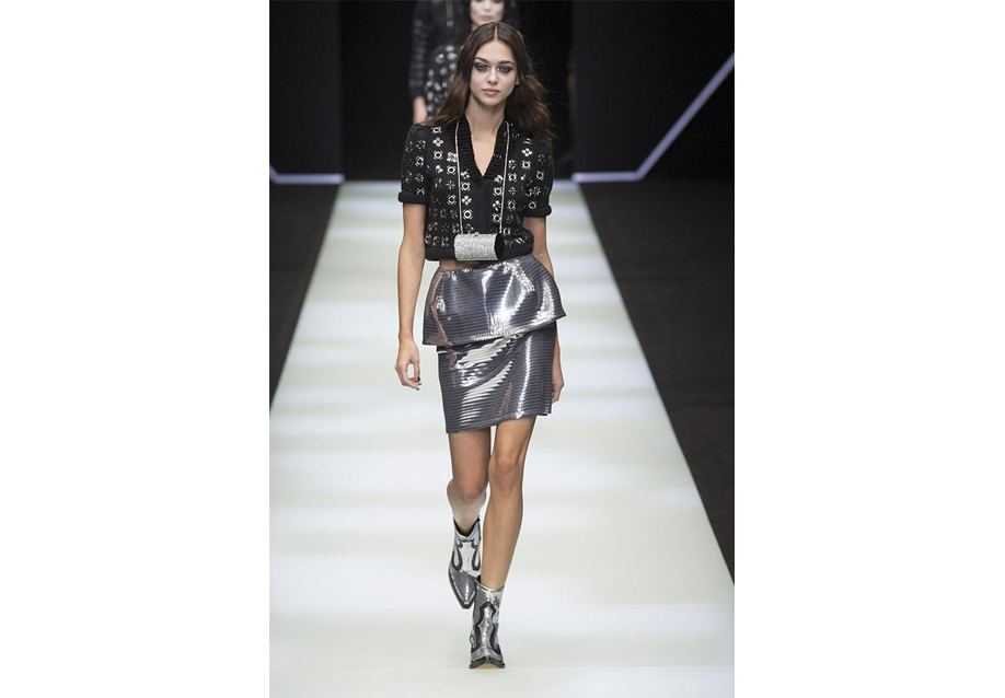 Стильные образы дизайнеры создают с мини-юбками цвета металлик, джинсовыми рубашками, белыми блузами и жакетами. Идеальным считается сочетание серебристого и серого в любой комбинации. С юбками-металлик разрешается надевать и кроссовки, и слипоны, и изящные босоножки, и сандалии в эко-стиле.