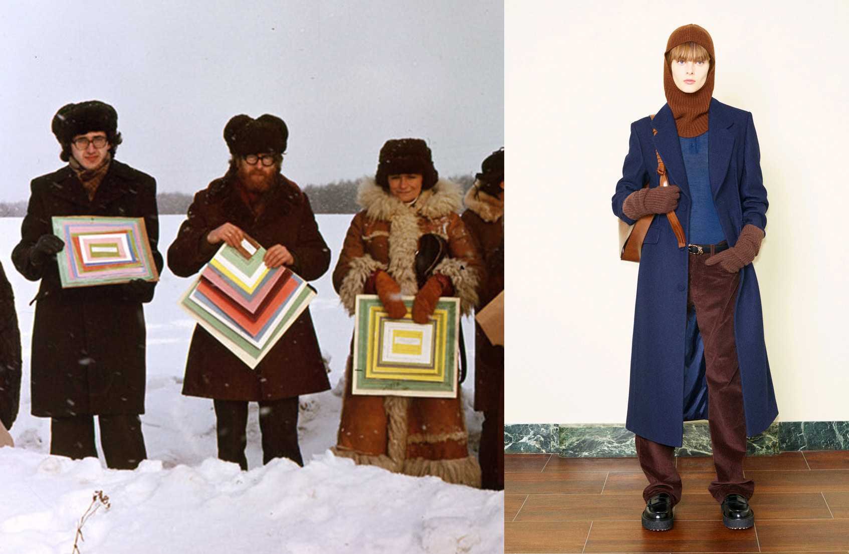 Стеганые куртки, шапки-шлемы, бадлоны и водолазки на фоне заснеженного леса. Что это? Шоу Miu Miu, лукбук Dsquared2 или советский акционизм? В 1976 году московские концептуалисты основали группу «Коллективные действия». Акции на природе художники документировали с помощью фотографий. На них попадаются люди, одетые адекватно эпохе и погоде. Впрочем, если сделать монтаж и поместить, скажем, девушку в Tod’s в кадр, вряд ли кто-то быстро заметит подмену. Вот и идея для новой акции. Виртуальной, как и положено в эпоху пандемии.