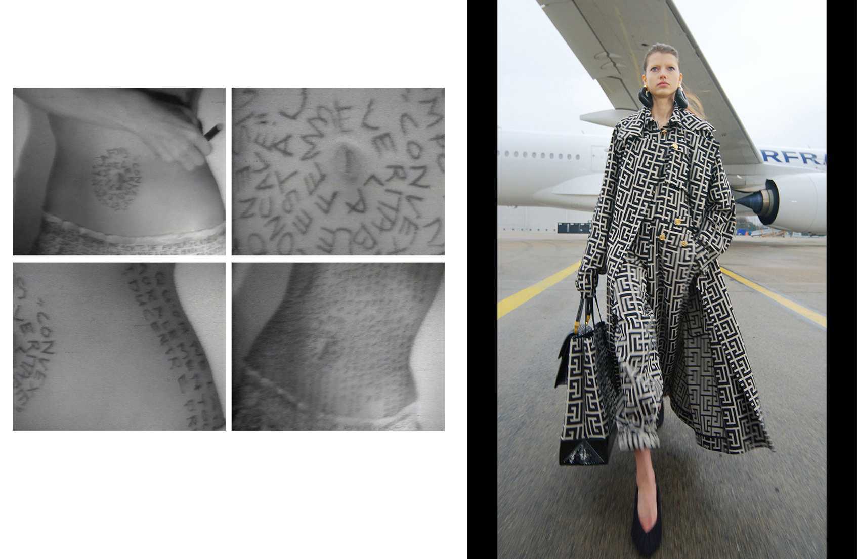 Логомания — древний тренд. Пещерные люди расписывали тела сакральными татуировками. Затем процесс лишился магии. Традиция могла быть предана забвению, но тут подсуетились художники и стали делать это на камеру. На фотографиях иранки Ширин Нешат арабской вязью покрыты отдельные части тела. Турчанка Нил Ялтер использовала тело вместо листа. В «Танце живота» она переписывала отрывок из книги Рене Нелли «Эротика и цивилизации», располагая текст вокруг своего пупка. Процесс снимала на видео.