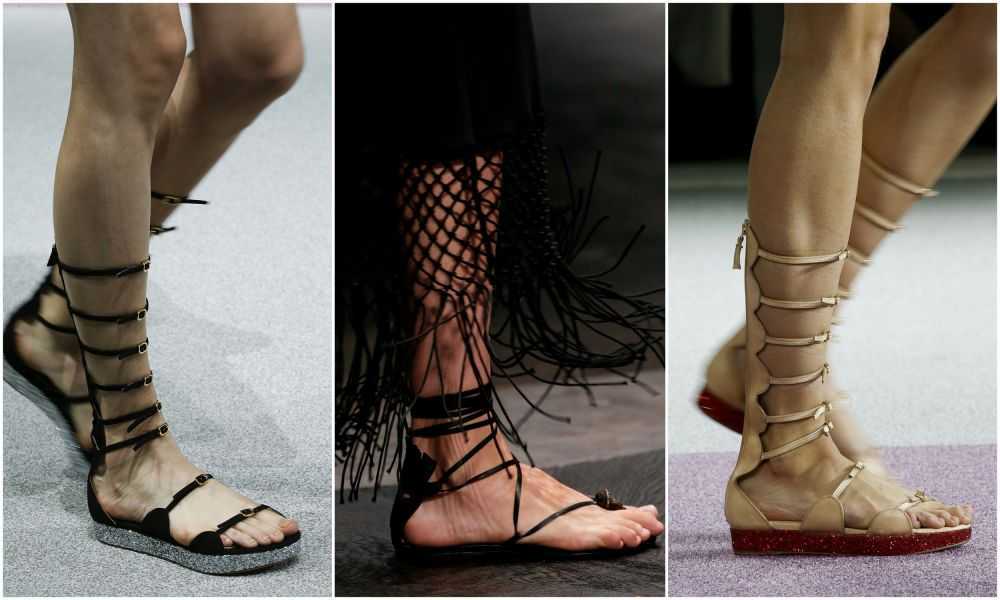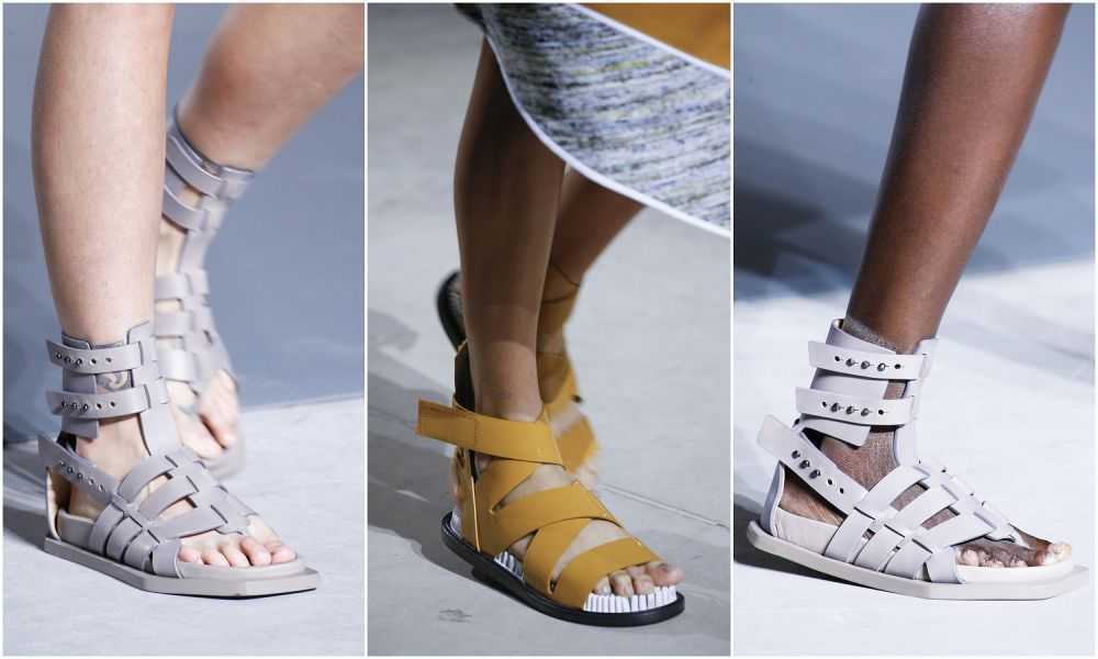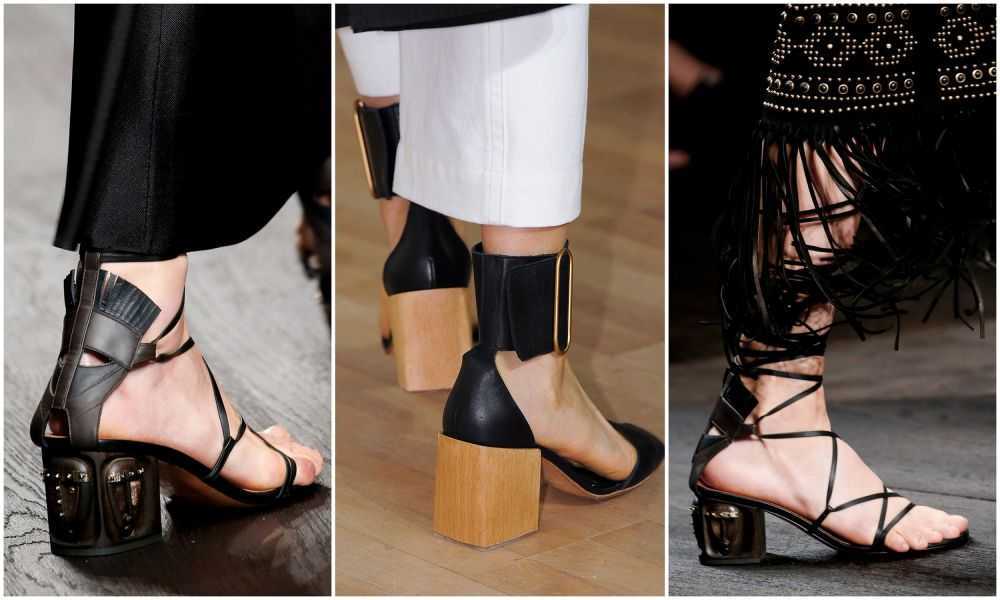 Дизайнеры не обошли вниманием и босоножки. В их коллекциях присутствуют модели на шпильке, массивном каблуке со шнуровкой, на платформе