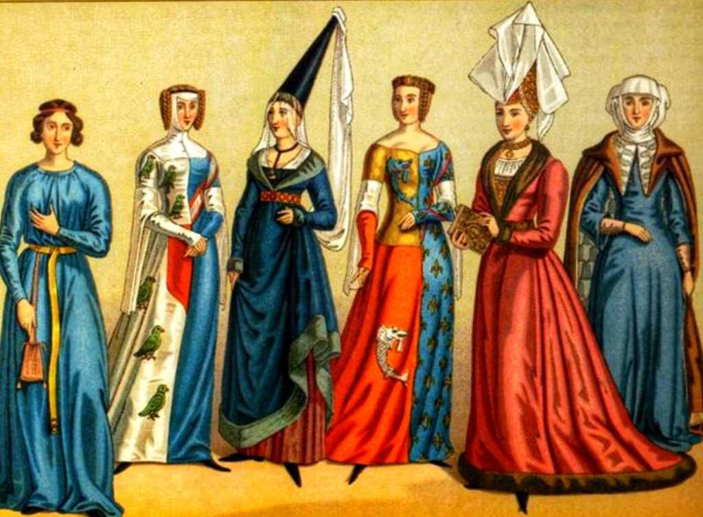 - Со второй четверти XV века. В массы попадает франко-бургундская мода, показавшая величие аристократии. Наряды стали шить тесными, их фалды тянулись по земле, а дополняли великолепие громоздкие головные уборы.