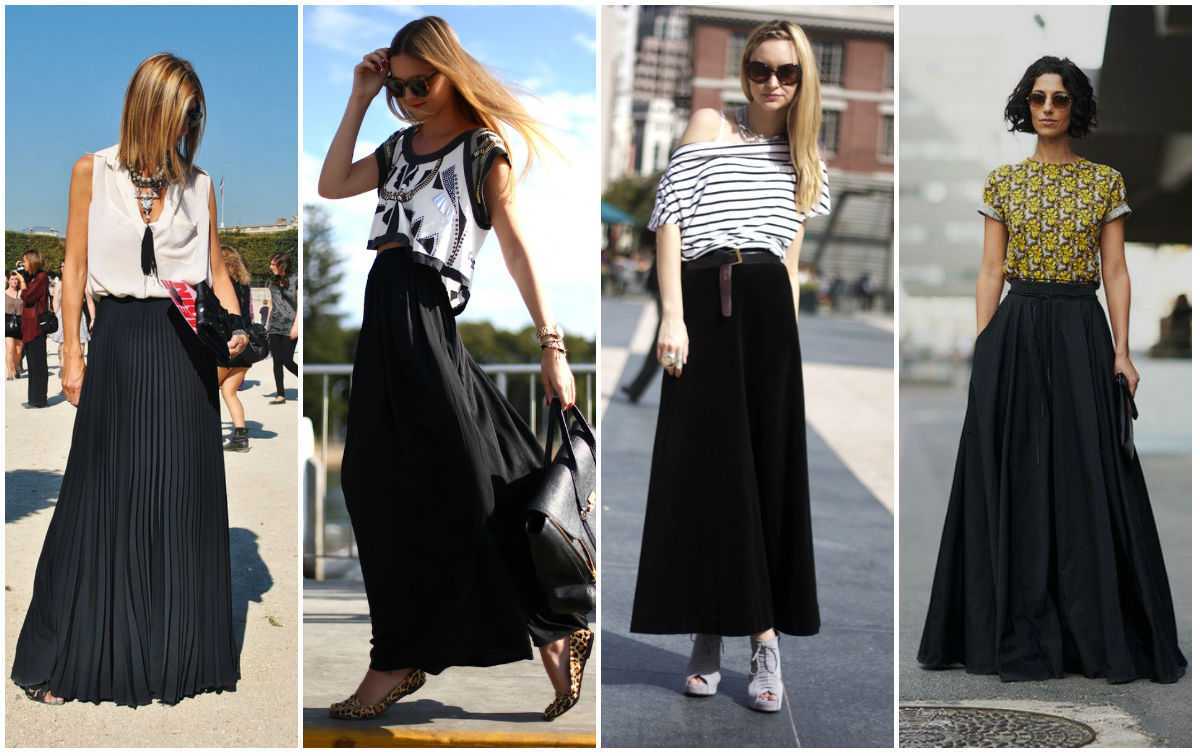 Черная длинная юбка вошла в моду еще в прошлом году. Ее популярность продолжается и по сей день. Довольно часто на улице можно встретить девушек и женщин в длинных юбках из шифона. Они отлично подходят для жаркого лета. В такой модели будет не очень жарко, она будет закрывать ноги от воздействия вредных солнечных лучей. Черная длинная юбка придает образу девушки романтизм и женственность. Также в моде длинная юбка черного цвета из шифона, которая имеет шлейф. Такие вещи необходимо уметь носить правильно. Поэтому верхнюю часть одежды лучше всего выбирать простую. Например, с черной длинной юбкой будет отлично смотреться белая хлопковая блузка или футболка без рукавов. На ноги можно обувать босоножки как на танкетке, так и на невысоком каблуке. Приветствуются украшения и наличие маленькой сумочки.