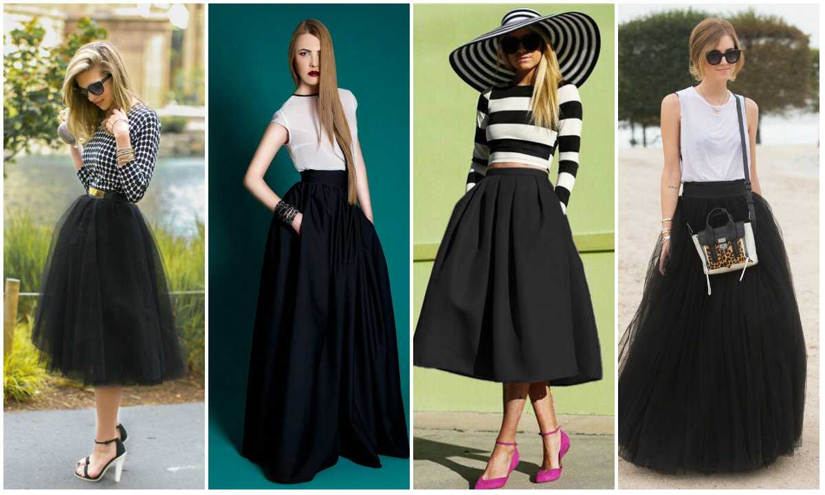 Обратим ваше внимание, что юбки такой длины часто бывают очень пышными, и поэтому встает вопрос, с чем носить черную пышную юбку. С длинным рукавом и объемным верхом лучше не рисковать и выбрать футболки и блузки либо с коротким, либо вообще без рукава