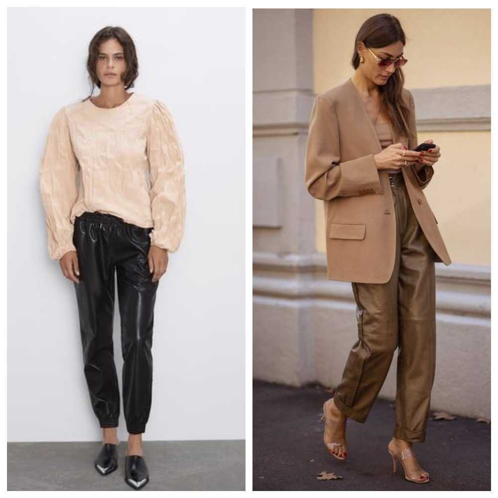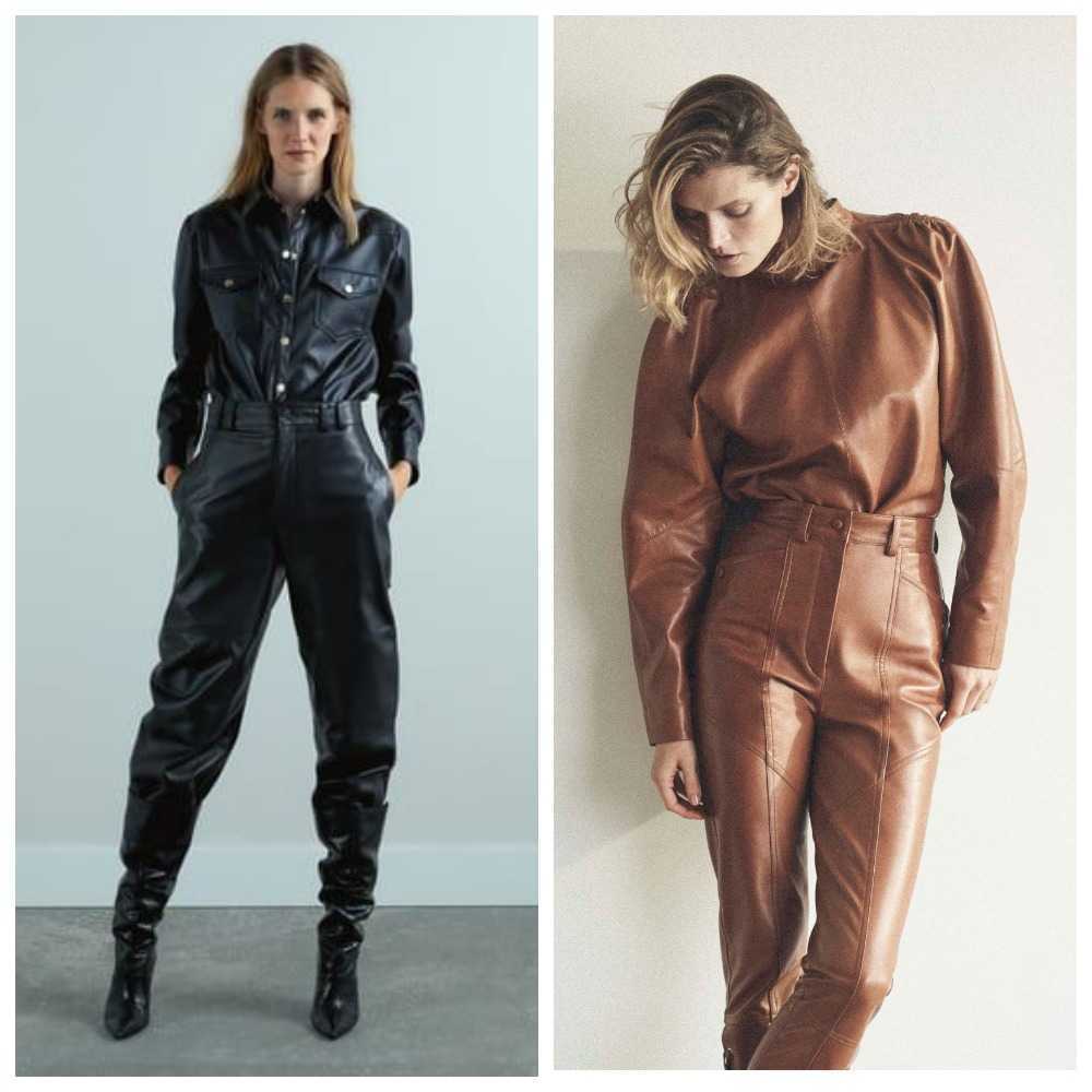 По факту, собрать кожаный тоттал лук легко. Потому что бренды, которые сейчас выпускают изделия из эко-кожи, составляют, как правило, готовые комплекты. То есть отшивают, например, бежевые кожаные брюки и такого же тона кожаную рубашку, либо пиджак.