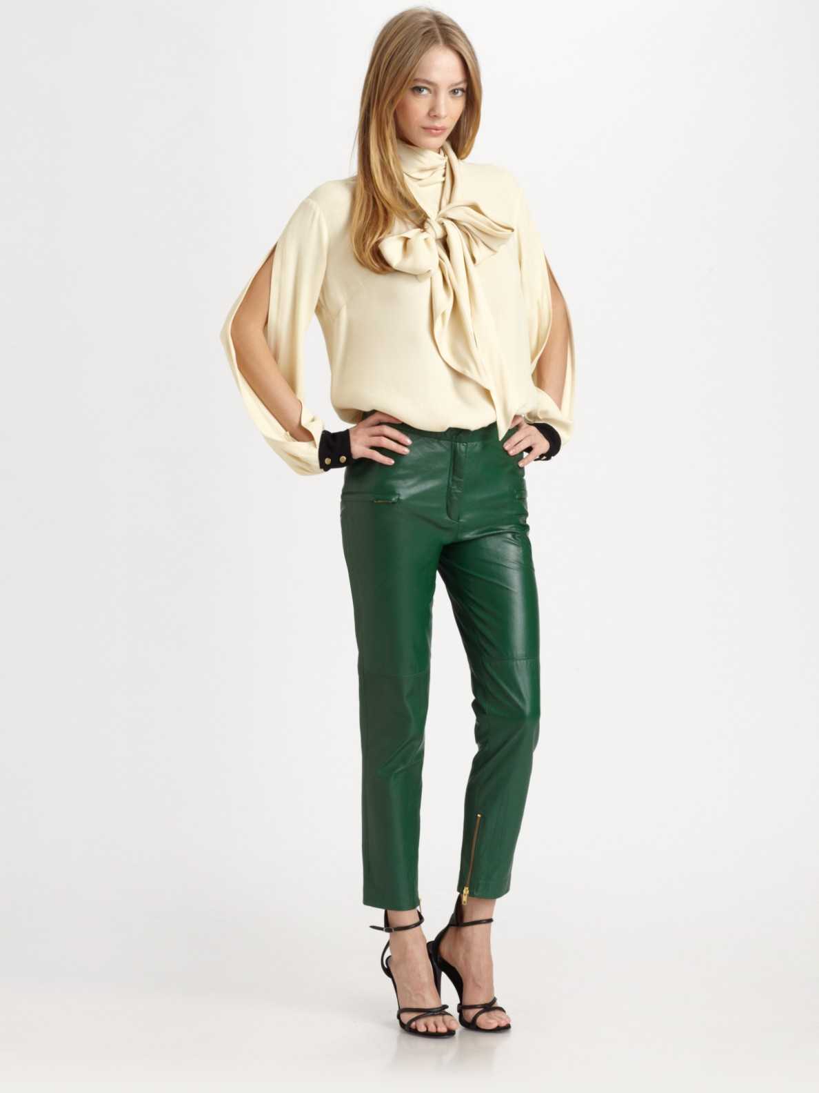 Подобные брюки необыкновенно актуально выглядят с широкой блузкой реглан. Также их стоит носить кожаной косухой. Такая куртка может иметь черный или рыжий оттенок.