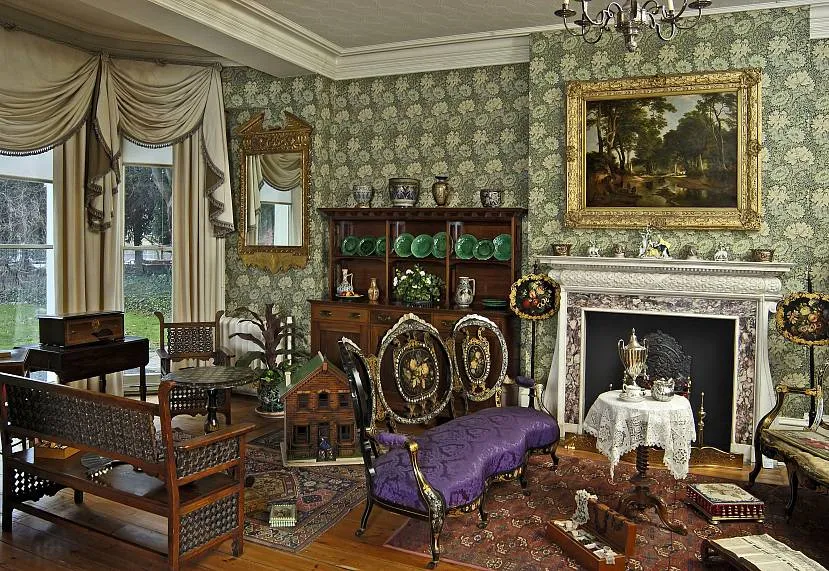 Визитная карточка направления – большие зеркала в массивной тяжёлой оправе, чёткие линии, наличие изгибов, обилие роскошного декора. В качестве основного лейтмотива выступает принт с изображением животных или растений, абстрактных геометрических фигур. В комнате много изящных статуэток, выполненных из металла или камня.