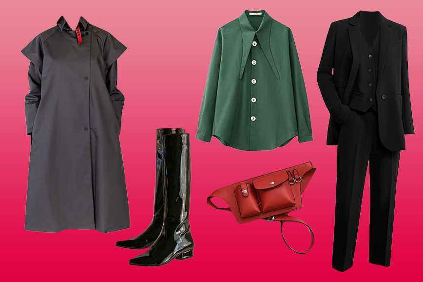 В основе образа — костюм-тройка. Строгий, элегантный и всегда актуальный. К нему мы подобрали рубашку в ретростиле, но носить его можно и на голое тело. В комплекте с рубашкой можно оставить только пиджак или только жилет. Брюки заправляем в высокие лаковые сапоги. Сверху плащ графитового цвета от российского бренда Sintezia. Последнее дополнение — небольшая поясная сумка.