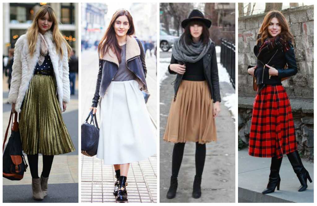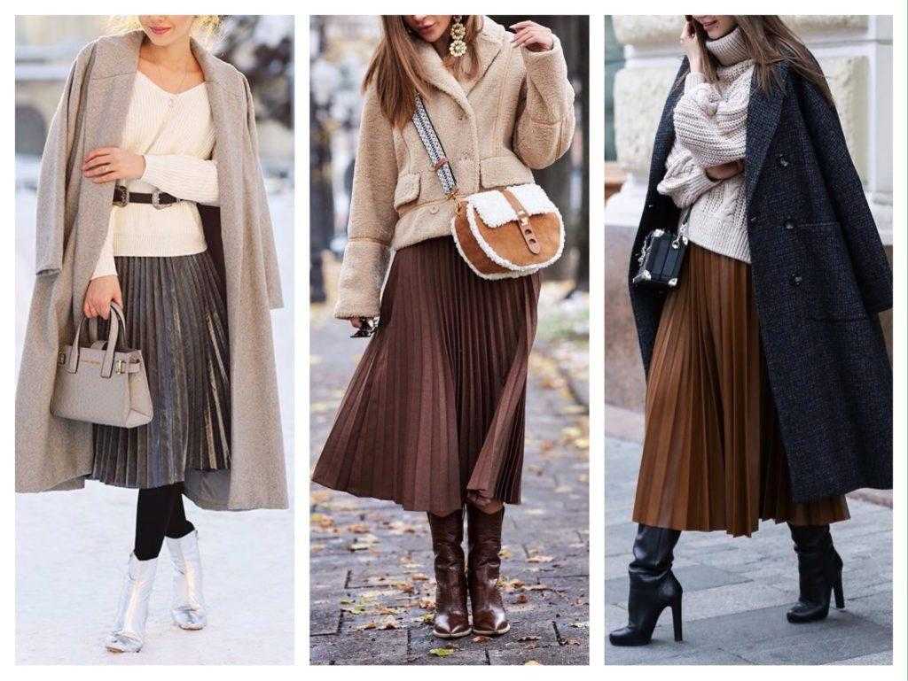 Плиссированная юбка в теплых образах: со свитером, курткой, пальто