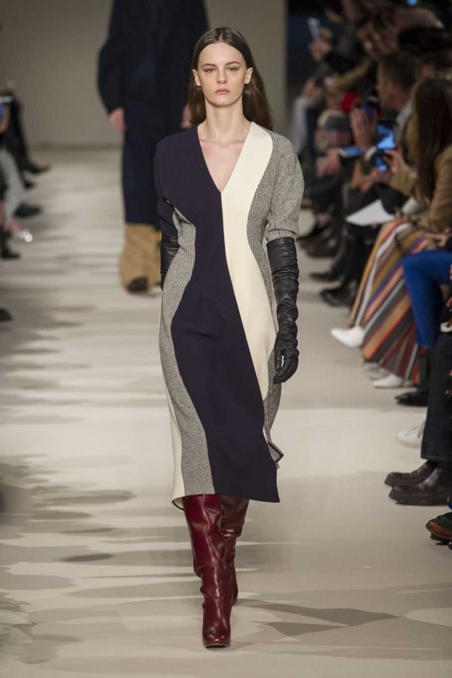 Более динамичный вариант представила Victoria Beckham, в качестве приемов – асимметрия и контрастные цвета.