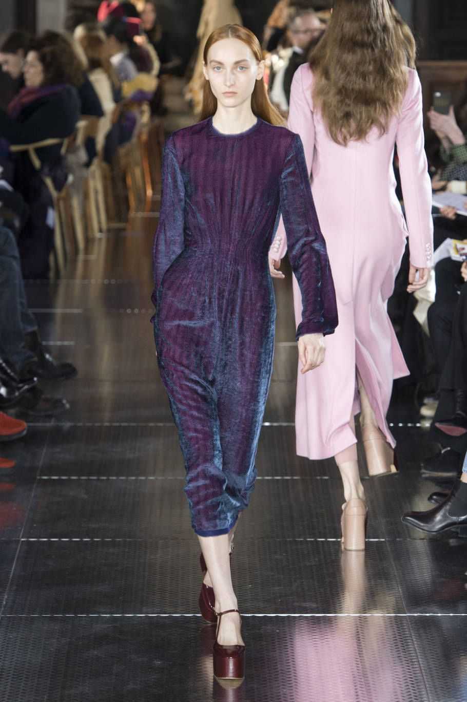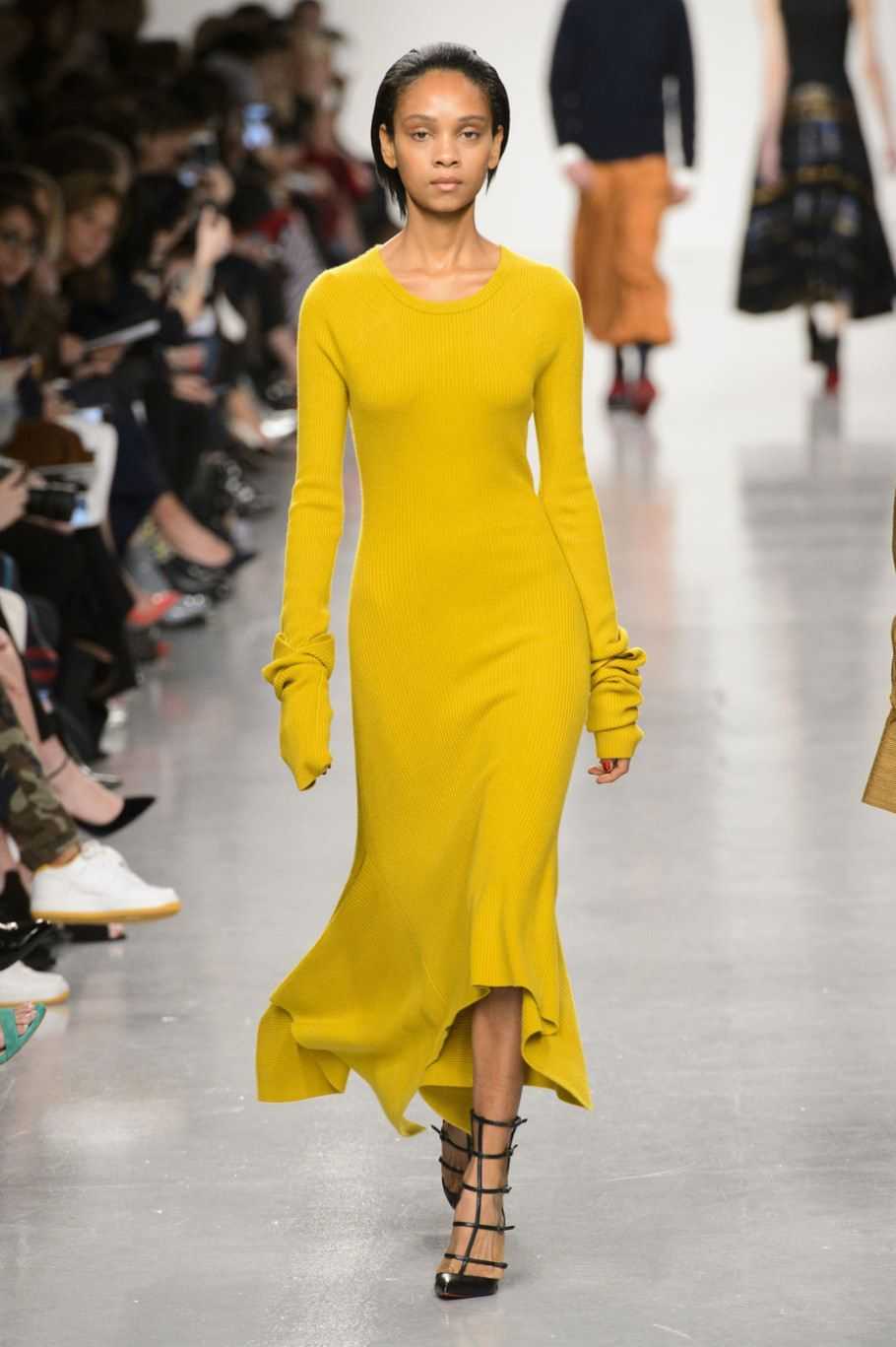 Платье из теплого материала, может смотреться стильно и без выразительных акцентов. Gabriela Hearst представила бархатное платье с легким градиентом – интересная фактура и глубокий цвет создают очень интересный эффект.