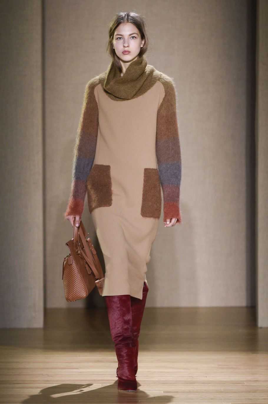Одна из самых главных тенденций сезона – комбинированные модные платья. Новинки с подиумов демонстрируют удачные комбинации материалов, фактур и цветов. К примеру, простой фасон платья Agnona, с шерстяными рукавами и выделенными карманами, смотрится уже не так скучно и академично.