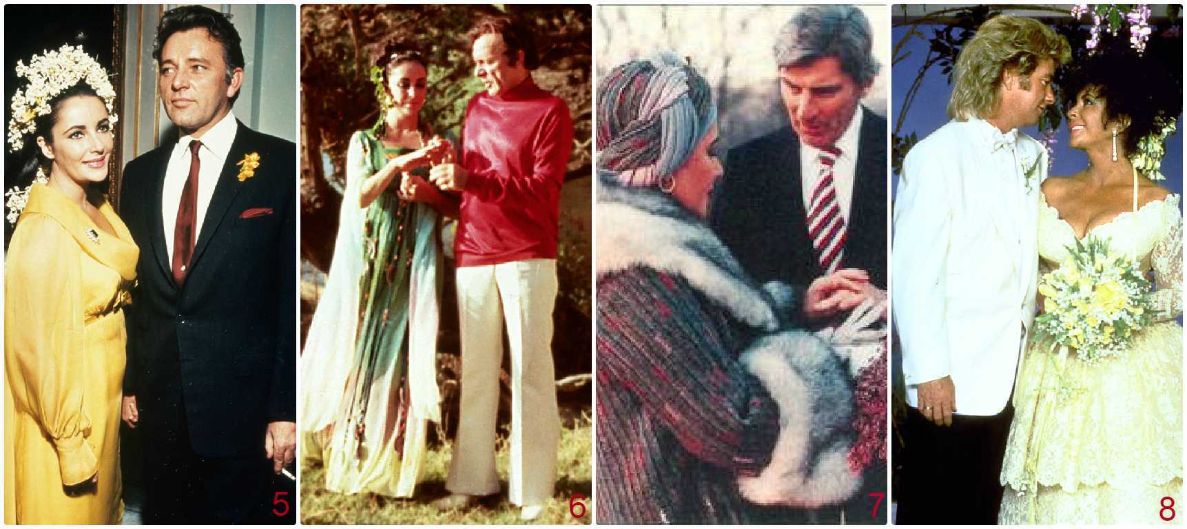 5. Элизабет Тейлор и знаменитый британский актер Ричард Бартон (1964) 6. Лиз и Дик. Попытка номер 2 (1975) 7. Элизабет Тейлор и американский политик, сенатор Джон Уорнер (1976) 8. Элизабет Тейлор и водитель грузовика Ларри Фортенски (1991)