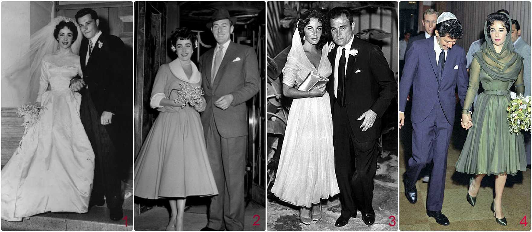 1. Элизабет Тейлор и наследник империи Hilton Конрад Хилтон мл. (1950) 2. Элизабет Тейлор и известный английский актер Майкл Уайлдинг (1952) 3. Элизабет Тейлор и знаменитый голливудский продюсер Майкл Тодд (1957) 4. Элизабет Тейлор и популярный американский эстрадный певец и актёр Эдди Фишер (1959)