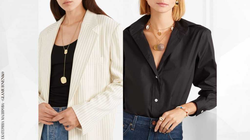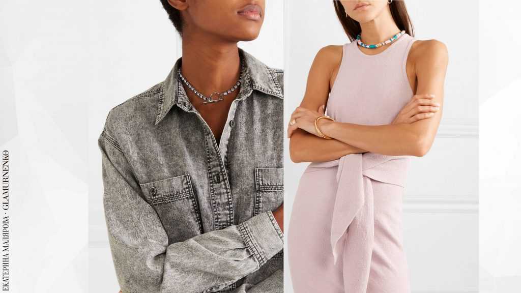 Примеры коротких миниатюрных украшений под шею. В изделии слева эффективно работает правило по контрасту, когда вечернее украшение с прозрачными камешками используется в повседневном комплекте, как здесь: с джинсовой рубашкой или курткой.