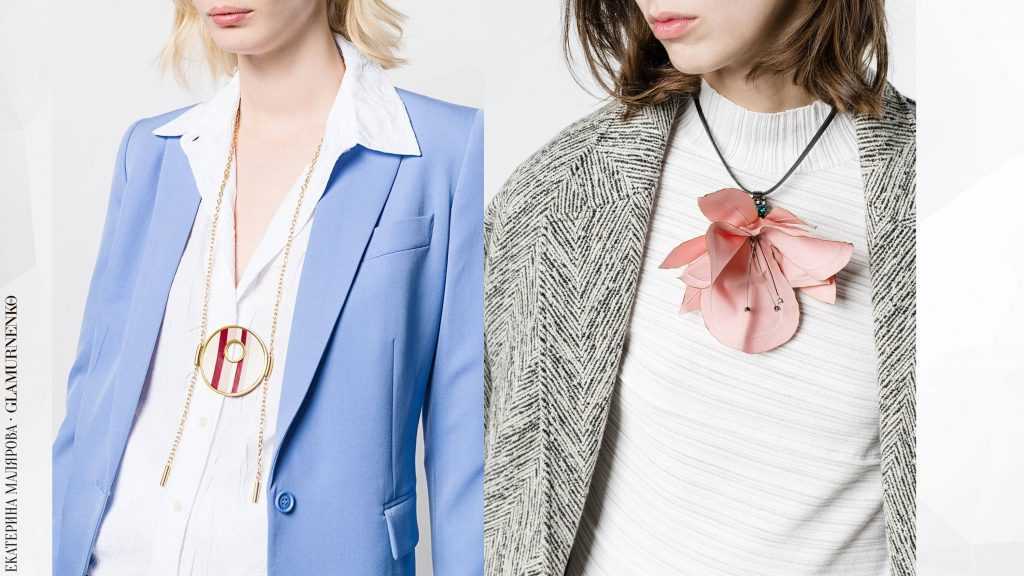 Такие украшения гармонично смотрятся на фоне строгих офисных костюмов, а также на фоне трикотажа.