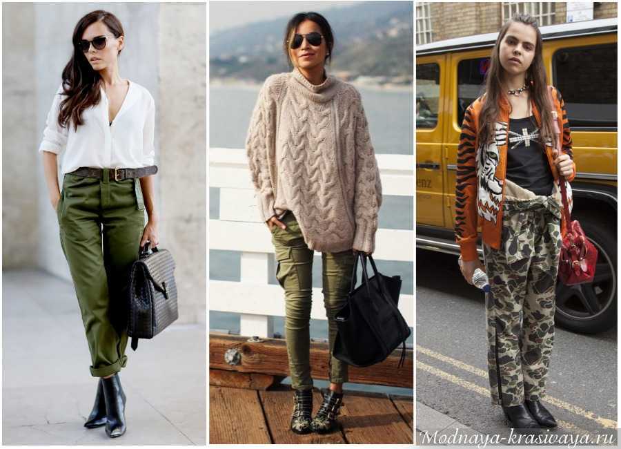 Дополнения – белые и камуфляжные футболки, свитера, черные или защитные пуловеры, толстовки. Головные уборы – фуражка, бейсболка, берет. Обувь – берцы, высокие сапоги, коричневые или серые ботинки, кеды, кроссовки. Сумки – объемные, почтальонки, рюкзаки.