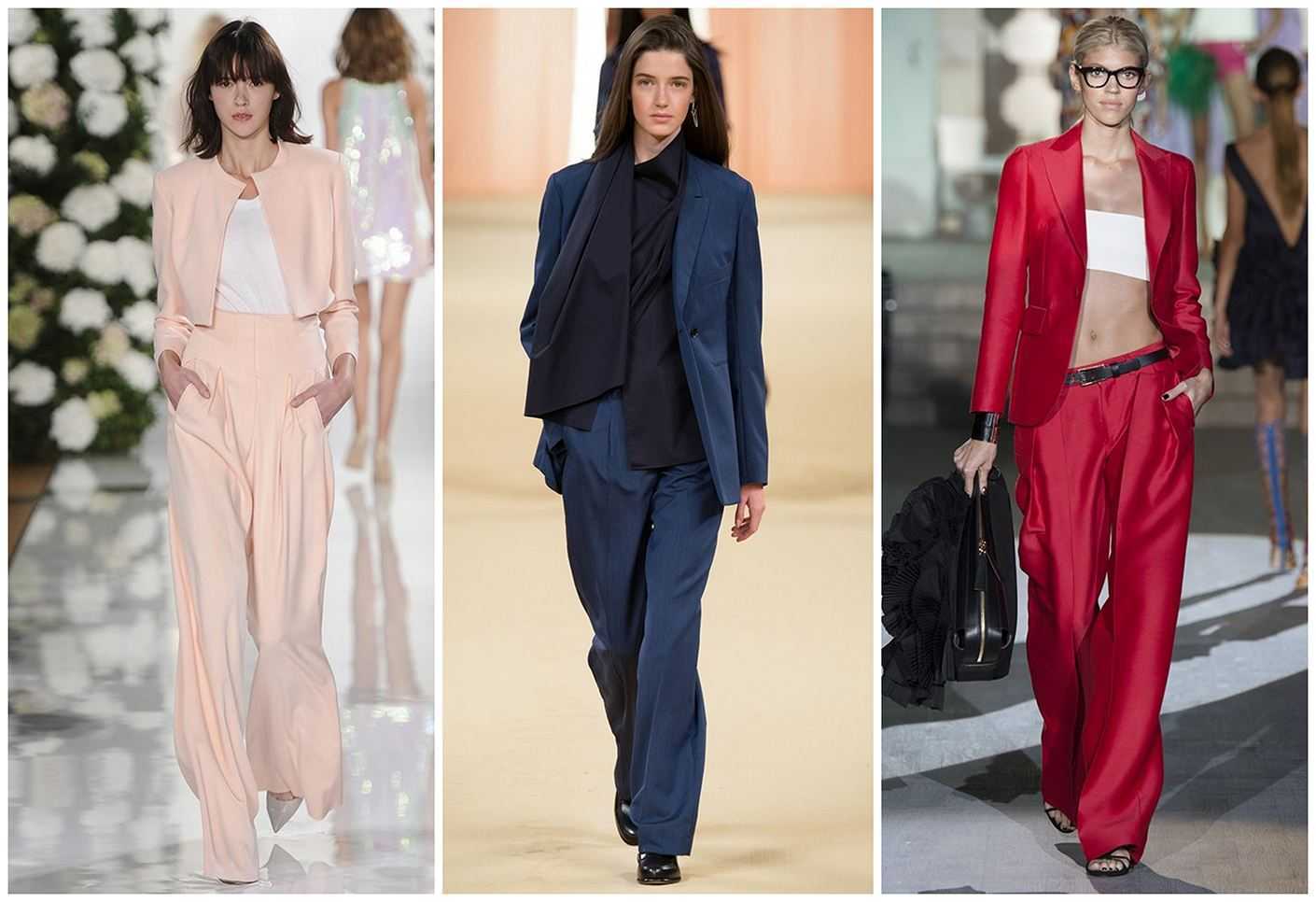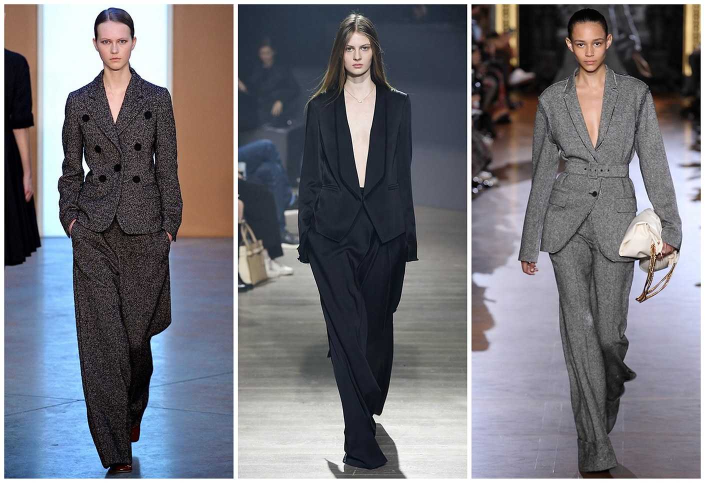 Для осеннего брючного костюма 2018 будут актуальны широкие брюки в пижамном и мужском стилях.