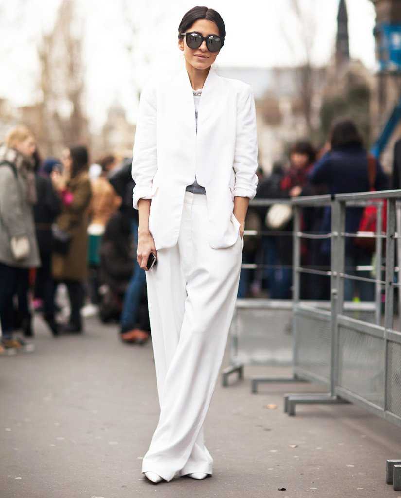 - С чем можно носить белый брючный костюм: с черными или цветными вещами. Не надо носить под него нюд и другие оттенки коричневой гаммы, также будьте осторожны с «грязными» и пастельными цветами.