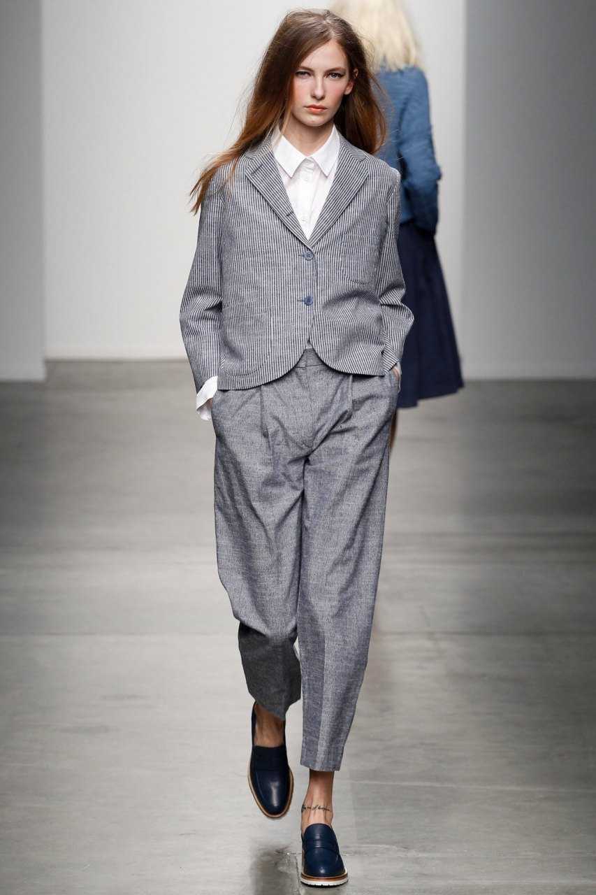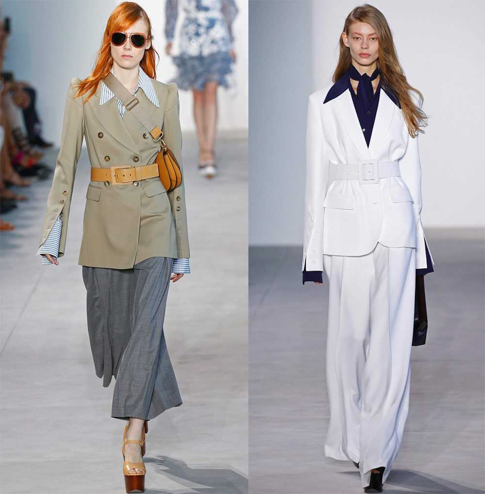 Очень популярны комплекты с верхом по типу джинсовой куртки, затягивающиеся на талии пояском. Такие костюмы подчеркивают хрупкие женственные линии и отлично сочетаются с обувью на каблуке.
