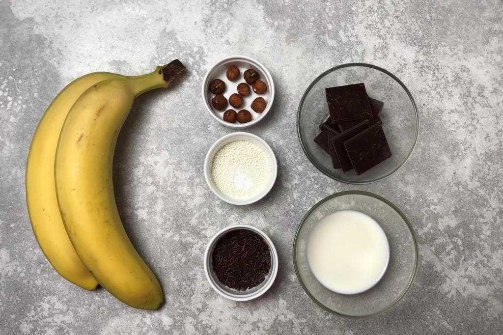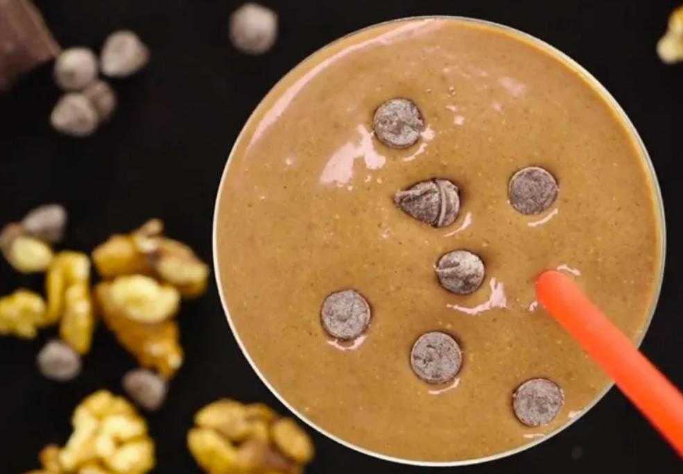 Для приготовления этого смузи взбейте банан, темный шоколад, грецкие орехи шоколадный протеиновый порошок, воду, лед и миндальное молоко.