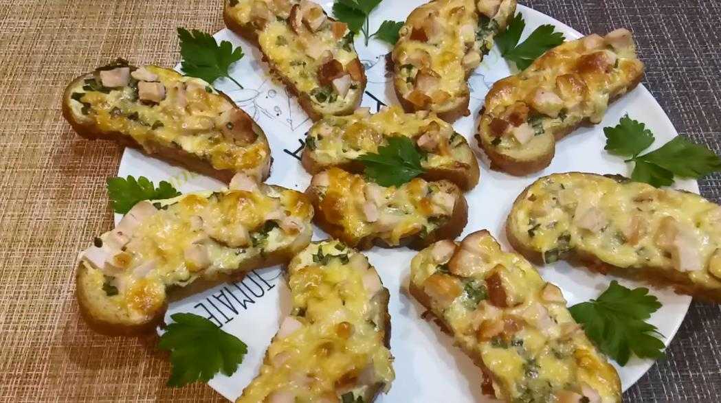 - Натереть каждую гренку чесноком, выложить начинку горкой, при желании посыпать моцареллой.