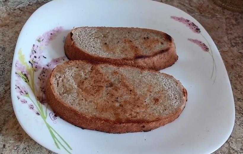 Кусочки хлеба поджариваем с двух сторон на сухой сковороде.
