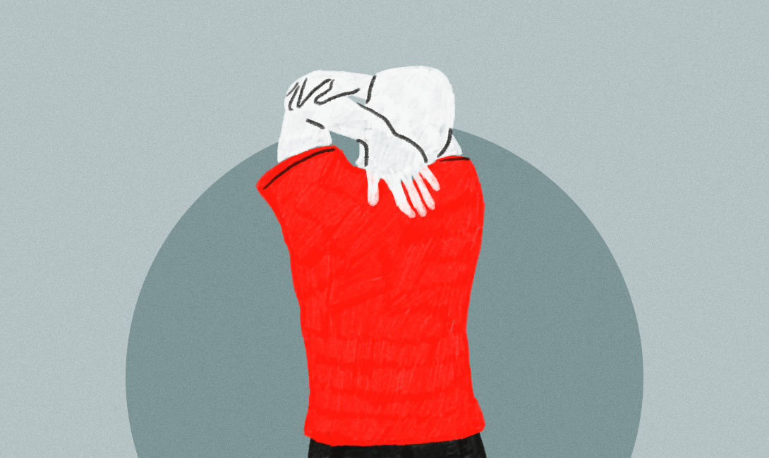 — Растягиваем плечо. Руку вытягиваем перед собой, свободной беремся за локоть и начинаем тянуть его к противоположному плечу. 30 секунд на каждую руку.
