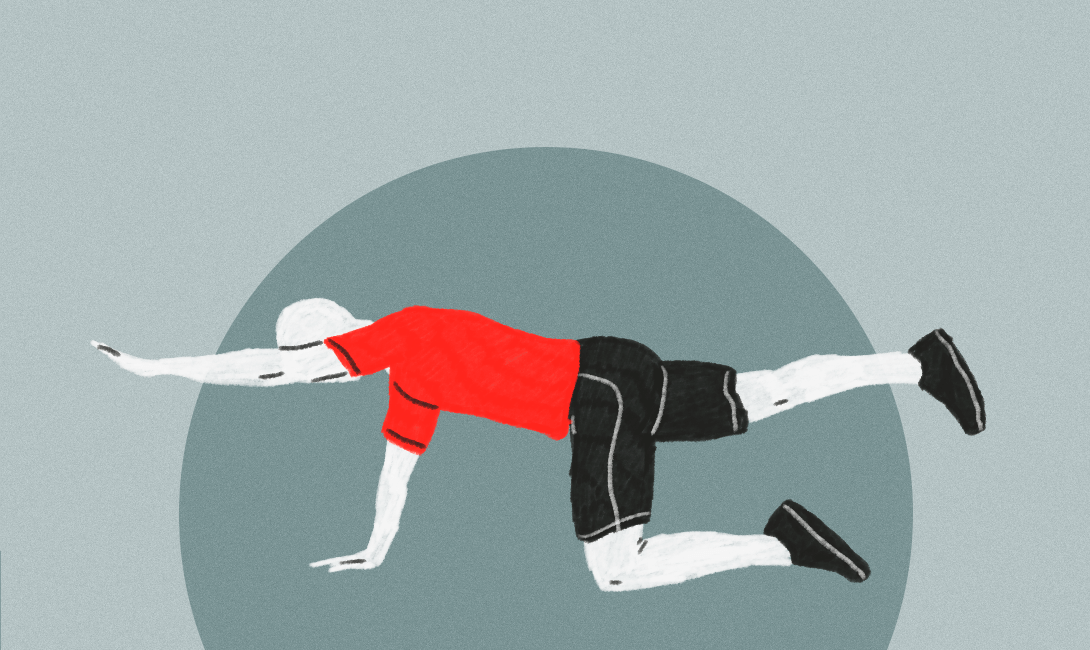 — У этого упражнения очень много нелепых названий, по которым его сложно идентифицировать, поэтому просто опишем, как оно выполняется. Встань на четвереньки и начни вытягивать левую руку и правую ногу как бы крест-накрест.
