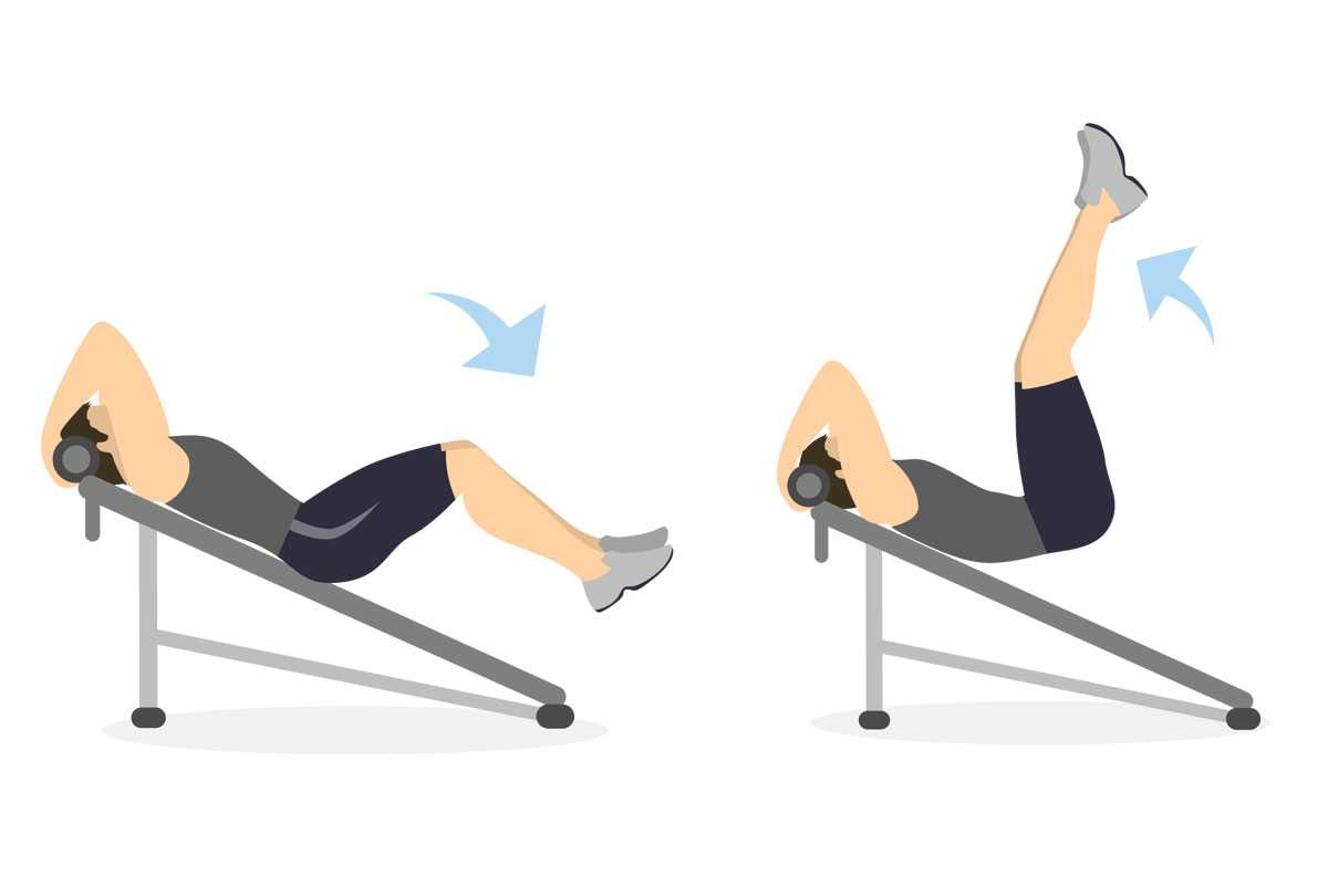 Облегченная версия подъемов ног в висе — подходит новичкам. За счет мышц пресса необходимо поднять ноги вверх, слегка оторвав поясницу от скамьи.