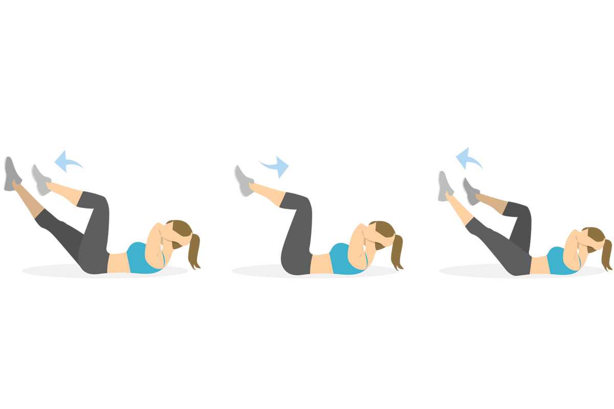 Лежа на спине, согните ноги в коленях, руки выпрямите, но не кладите их на пол. Приподнимите корпус и сделайте наклон влево, ощущая работу косых мышц. Сразу же выполните такой же наклон вправо. Одно из основных упражнений из тренировки на косые мышцы живота интенсивно прорабатывает боковую мускулатуру корпуса.