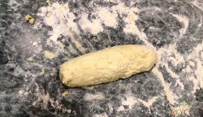 Присыпьте поверхность стола небольшим количеством муки. Раскатайте готовую массу в колбаску диаметром примерно 4 см и разрежьте широким ножом на равные части.