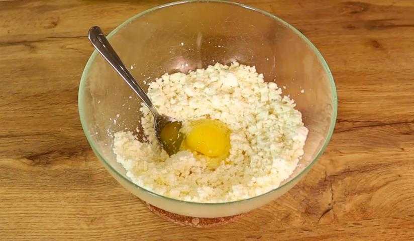 2. Раскалываем туда одно куриное яйцо. Вминаем яйцо хорошо, творог должен будет стать желтоватого цвета.