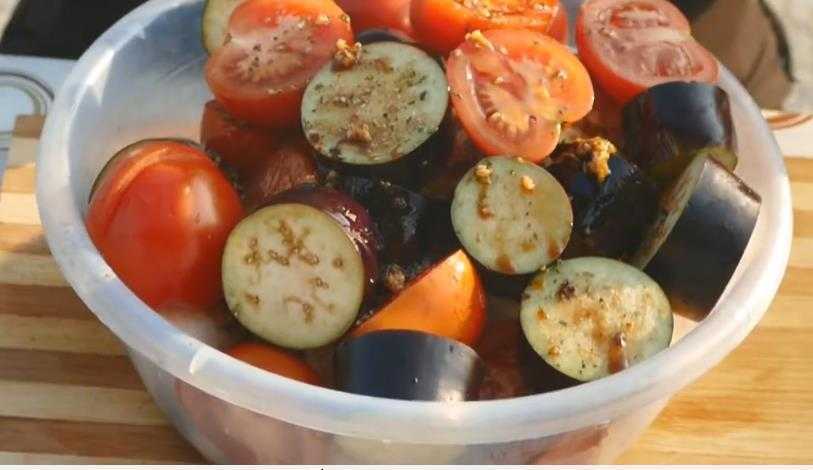 Грибы положить в глубокую миску, помидоры нарезать на 2 части, удалив плодоножку. Баклажаны нашинковать крупными кольцами. Прованские травы соединить с растительным маслом и соевым соусом. Выдавить через пресс чеснок, перемешать до однородного состояния.