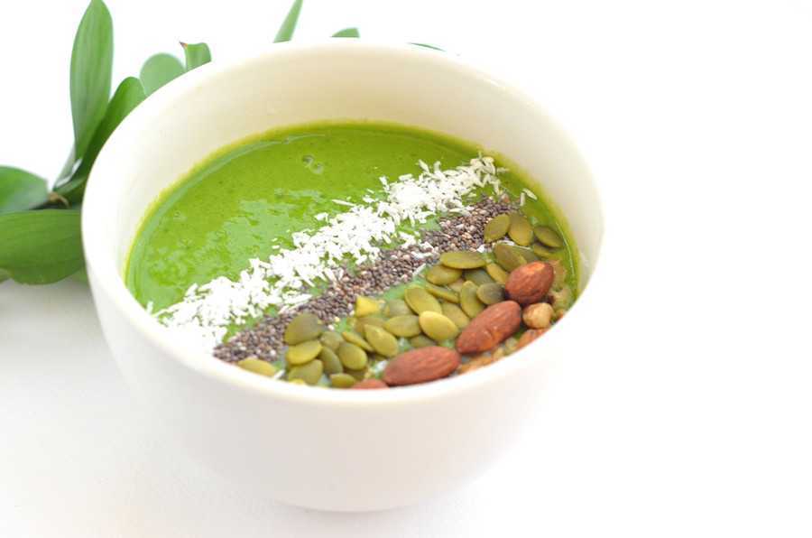 Зеленый смузи-боул с утра очищает организм, бодрит его и улучшает дыхание клеток. Хотите приготовить шикарное блюдо с нежной текстурой, которое подарит массу приятных ощущений? Итак, начнем. В блендер отправят 2 замороженных банана, ¼ часть авокадо, 2 стакана шпината свежего, чашку свежего кейла, 1 ложку молотых льняных семян, 200 г апельсинового сока. Цвет должен получиться равномерным. Смузи надо разложить по боулам, присыпаем гранолой, тыквенными и подсолнечными семечками.
