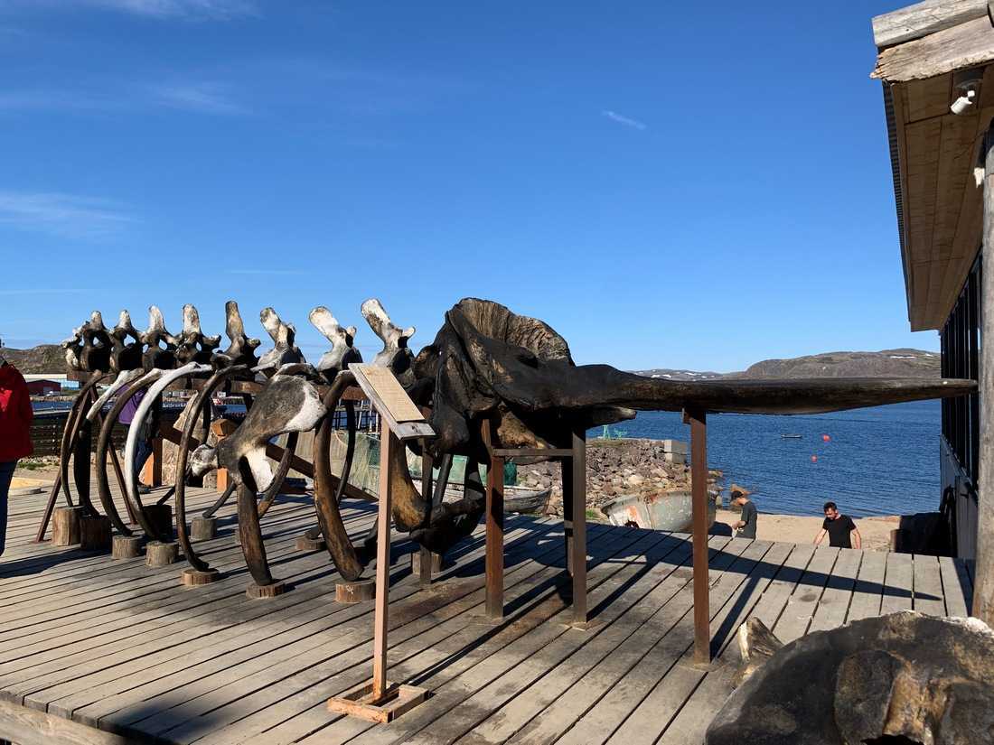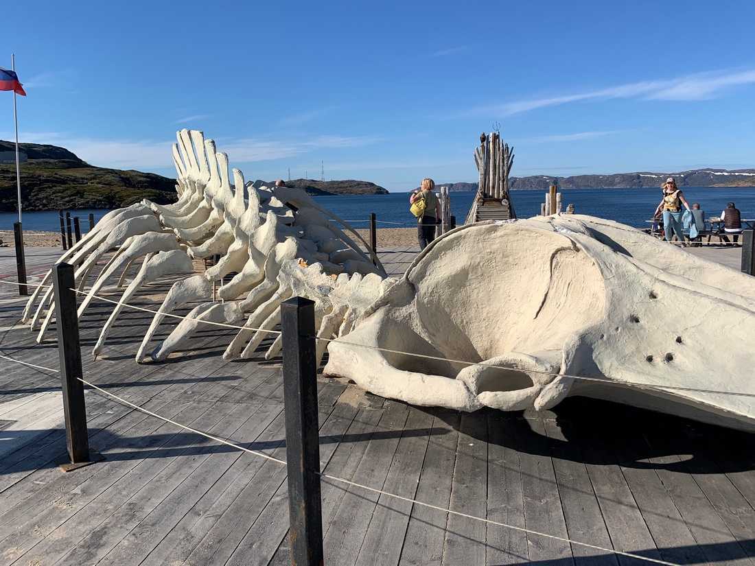 На пляже с качелями ненастоящий скелет кита, а вот у Лодейного (69.179109, 35.122019) есть настоящий скелет кашалота. Он был выброшен на берег в 2019 году.