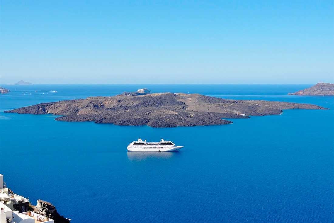 Почти 3700 лет назад произошло грандиозное извержение вулкана Санторини, снесшее вершину острова. Морская вода устремилась в образовавшуюся кальдеру, в результате чего появилась огромная лагуна, настолько глубокая, что даже круизные суда, кроме разве что самых больших, могут бросить здесь якорь.