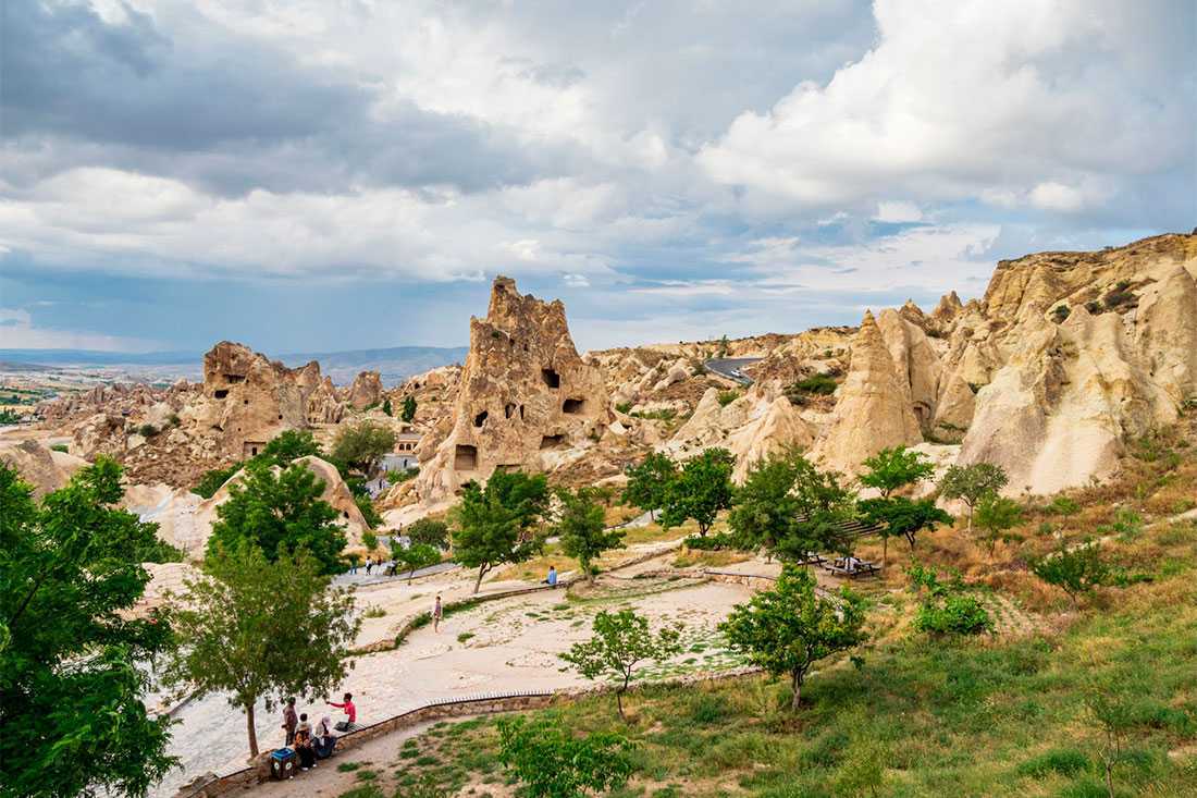 Местность Гёреме в Каппадокии образовалась в ходе извержений нескольких вулканов. Хлынувшие из подземных недр потоки лавы и пепла застыли, образовав причудливые очертания и формы. Получившаяся в результате остывания горная порода называется вулканический туф. Она мягкая, но при этом прочная, так что хорошо подходит в качестве строительного материала.