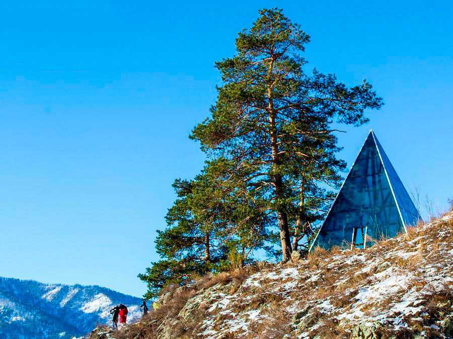 Рядом с гостиничным комплексом «Усадьба Бычковых», расположенным на юго-восточной окраине поселка Чемал, вы найдете довольно необычное сооружение – Пирамиду золотого сечения. Эту бирюзовую пирамидальную конструкцию построил несколько лет назад местный житель Анатолий Бычков.